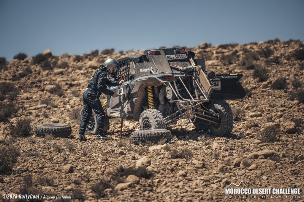 De buggy bleef achter in woestijngebied en wordt later opgehaald. De etappe van vandaag ging over een gevarieerd parcours van Foum Zguid naar M’Hamid. Het traject bevatte snelle grindpaden, het droge meer Iriki en de eerste echte duinvelden van de MDC 2026. Het is voor VG Rally nog niet duidelijk of en hoe hun verdere deelname aan de rally verloopt. .