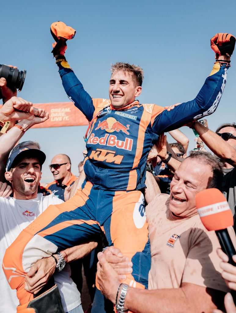 Benavides greep die kans met beide handen aan. De Argentijn nam de leiding over in de slotminuten. Hij won de rally met het kleinste verschil ooit: twee seconden. Het vorige record stond op naam van zijn broer Kevin Benavides. Die won in 2023 met 43 seconden voorsprong op Toby Price.